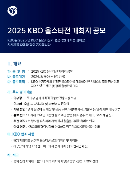 ![]() 2025 KBO 올스타전 개최지 공개모집 안내 |