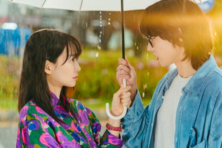 비 오는 날, 우산 하나를 함께 나눠 쓴 채 눈맞춤을 이어가는 두 사람의 모습이 진한 임팩트를 남긴다. 해영과 지욱 사이의 아슬아슬한 거리, 로맨틱한 감성 물씬 풍기는 배경까지 스틸만으로도 한 편의 로맨스 서사가 절로 떠오르게 해 보는 이들의 마음을 간지럽힌다.