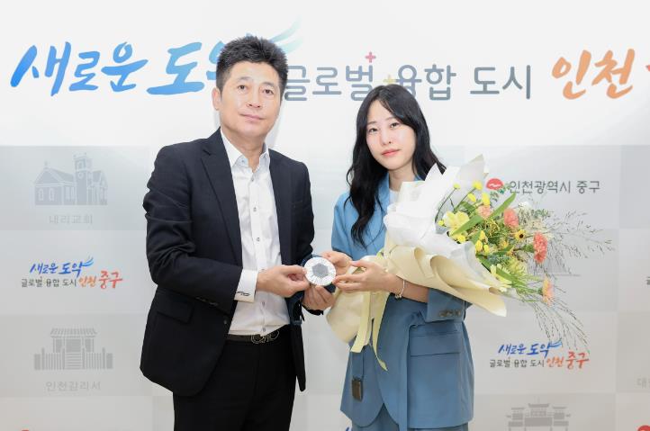 김정헌 중구청장은 전은혜 선수에게 꽃다발을 건네며 환영과 축하의 인사를 전했다.