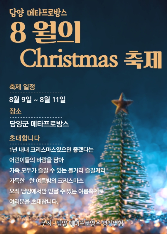 담양 메타프로방스 상가 연합에서는 “산타마을이라는 주제로 진행되는 여름 축제인 만큼 상인들 모두가 산타가 되어 방문하시는 군민과 관광객에게 감동과 즐거움을 선사하기 위해 준비에 최선을 다했다”라며 “더운 여름 열기를 식혀줄 ‘8월의 크리스마스 축제’에 함께해 주시길 바란다”라고 말했다.