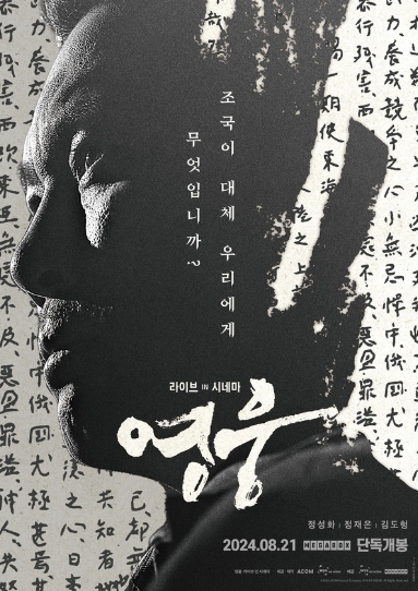 8월 21일 메가박스 단독 개봉 소식을 알린 '영웅: 라이브 인 시네마'는 1909년 10월, 하얼빈에서 이토 히로부미를 사살한 안중근 의사가 조선의 독립을 결의하고 거사를 준비하던 때부터 사형 판결로 죽음을 맞이하던 순간까지를 그린 대한민국 대표 오리지널 뮤지컬 필름.