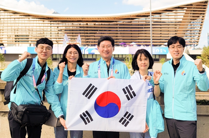 이상일 시장은 김수지 선수 응원을 끝낸 뒤 친환경 목조 건축물인 파리 올림픽 아쿠아틱 센터를 둘러봤다.