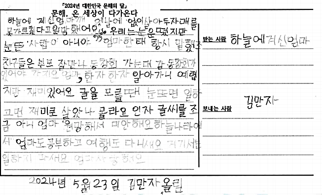 또한 김만자 어르신은 엽서 작품을 통해 엄마에 대한 그리움을 표현해 뭉클한 감동을 안겨주었다. 비록 맞춤법은 완벽하지 않지만 누구보다 순수하고 진솔한 마음을 가득 담아 하늘에 계신 엄마에게 엽서를 띄웠다.