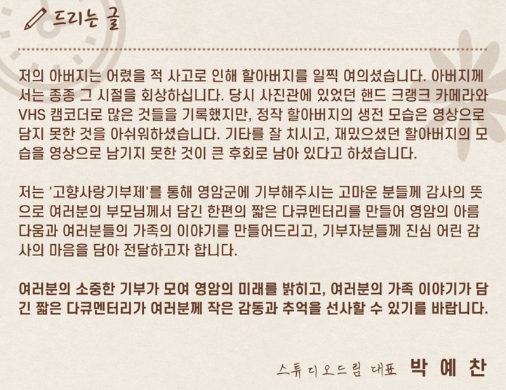 박 대표는 “고향사랑기부자 가족에게 영원한 추억으로 남을 이야기를 담아 전하고 싶다. 뜻 깊은 기부에 의미 있는 선물로 감동을 전하려고 부모님 생활 영상을 기획했다”고 밝혔다.