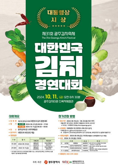참가 신청은 제31회 광주김치축제 누리집이나 세계김치연구소 누리집에서 신청서 양식을 내려받아 이메일 또는 우편을 통해 제출하면 된다.