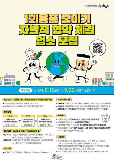 ![]() 순천시, '1회용품 줄이기 자발적 협약' 대상자 모집 |