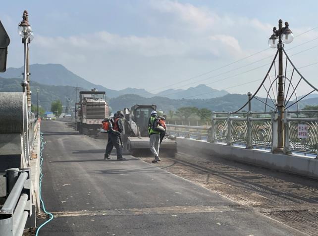 ![]() 지난 4월, 군동면 석교교 교면 방수 및 재포장 작업이 한창이다. |