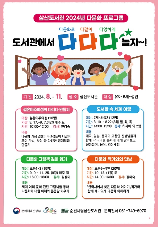 이번 다문화 프로그램은 모두 무료로 진행되며 참여 신청은 순천시립도서관 누리집을 통해 온라인 접수 가능하며, 기타 문의 사항은 삼산도서관으로 연락하면 된다.