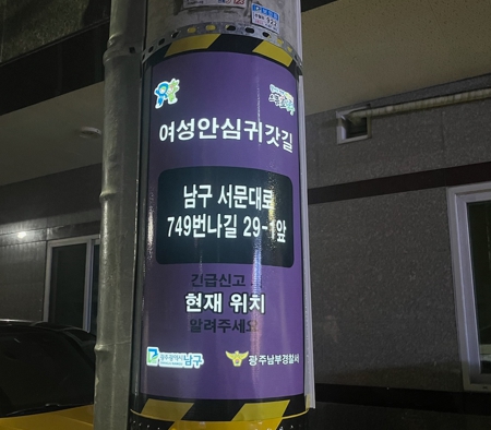 현재 남부경찰서는 주월동 푸른길 도서관 뒤를 비롯해 양림동 행정복지센터 주변, 중국 총영사관 뒤 등 관내 11곳을 여성 안심 귀갓길로 지정해 운영하고 있다.