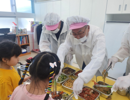 ![]() 김재철 도의원이 8월 14일, 미력초등학교를 찾아 행복도시락 급식 봉사를 하고 있다 |
