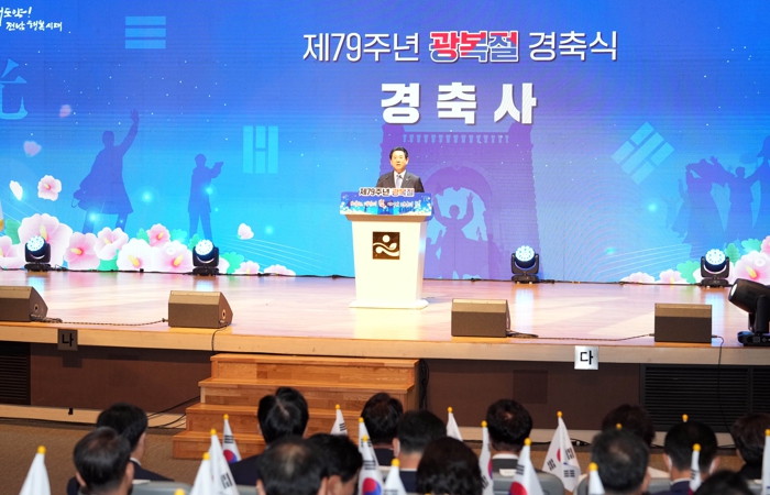 ![]() 김영록 전라남도지사가 15일 도청 김대중강당에서 열린 제79주년 광복절 경축식에서 경축사를 하고 있다. |
