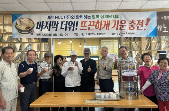![]() 여수 소라종합사회복지관(관장 정성훈)은 여천NCC㈜(공동대표이사 이우진, 김명현)의 후원으로 말복을 맞이한 ‘마지막 더위! 뜨끈하게 기운 충전’ 행사를 열었다. |