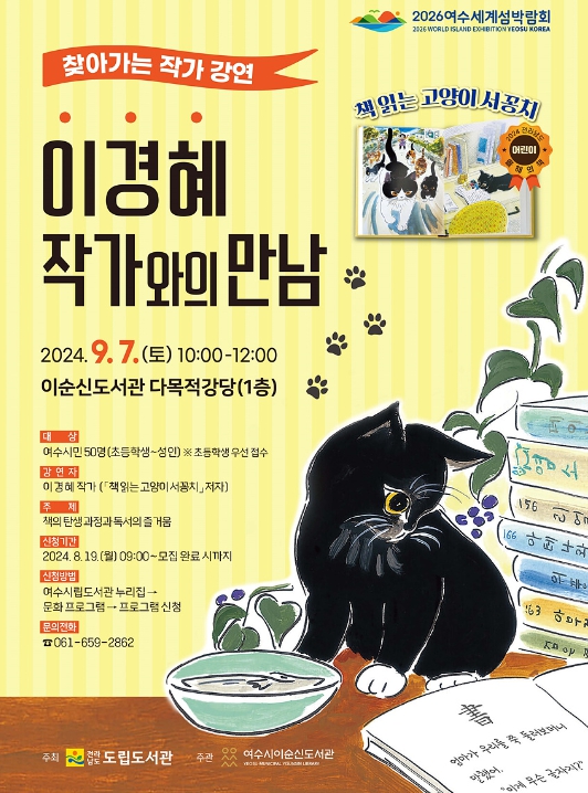 이경혜 작가는 오는 9월 7일 오전 10시에 이순신도서관에서 ‘책의 탄생 과정과 독서의 즐거움’을 주제로 『책 읽는 고양이 서꽁치』책 소개와 집필 과정, 책에 언급된 도서들에 대해 강연하고 퀴즈를 통해 독자와 질의응답 시간을 가질 예정이다.