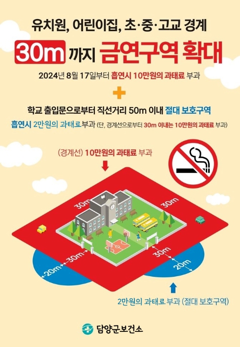 또한 기존 ‘담양군 금연환경 조성 및 간접흡연 피해방지 조례’에서 정한 학교 절대정화구역(학교 출입문으로부터 직선거리 50m 이내)은 현행 금연 구역으로 유효하며, 30m~50m 이내 흡연 시 2만 원의 과태료가 부과된다.