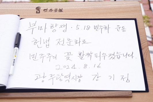 ![]() 강기정 광주광역시장이 16일 오후 부산광역시 중구 부산민주공원을 방문해 넋기림마당을 참배한 뒤 방명록을 작성하고 있다. |