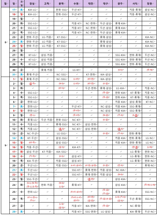![]() 2024 KBO 정규시즌 잔여 경기 재편성 일정 |
