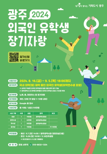 참가자는 오는 9월 7일 광주시청 대회의실에서 예선심사를 거쳐 9월 13일 본선 진출 10개팀을 선발한다. 본선에 진출한 10개팀은 오는 9월 28일 ‘외국인 유학생의 날’ 행사 당일 5·18민주광장 무대에서 경연을 펼친다.