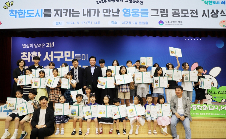 이번 공모전은 ‘착한도시 서구에서 아동의 4대 권리를 실천하고 있는, 내가 만난 영웅의 모습’을 주제로 ▲유치부 ▲초등저학년부 ▲초등고학년부 ▲중·고등부 4개 부분으로 진행됐으며 총 304건의 작품 중 내부심사 및 전문가 심사를 통해 최종 32명의 수상자가 선정됐다.