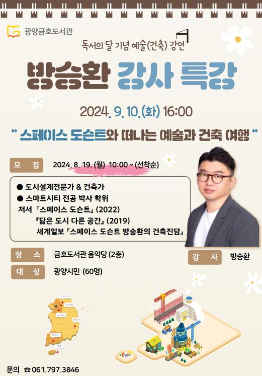 ![]() 광양금호도서관, ‘스페이스 도슨트와 함께하는 건축여행’ 떠나요! |