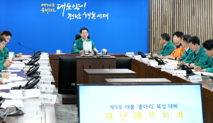 ![]() 김영록 전라남도지사가 20일 오전 도청 재난종합상황실에서 태풍 종다리 북상 대비 재난대책회의를 주재하고 있다. |