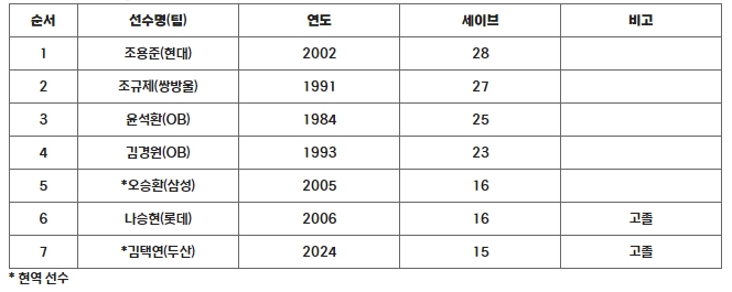 ![]() 역대 신인선수 10세이브 이상 선수(2024. 8.19 기준) |