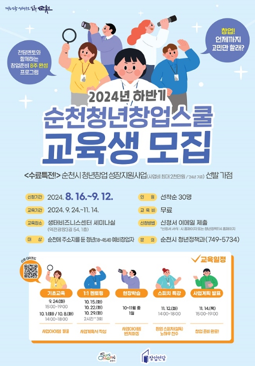 ![]() 순천시, 2024년 하반기 순천청년창업스쿨 교육생 모집 |