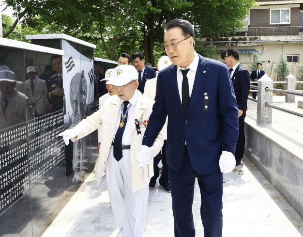 ![]() 2024년 현충일 화순군 충혼탑 참배 후 구복규 화순군수와 김중환 6.25참전유공자회 화순지회장이 충혼탑 주변의 유공자 명비를 둘러보고 있다. |