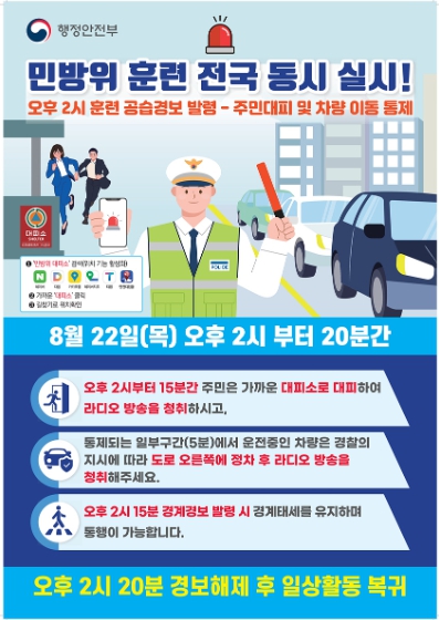 정기명 시장은 “민방위훈련은 공습 시 시민 스스로 생명을 지키기 위한 훈련”이라며 “가까운 대피소를 미리 확인하고 비상시 행동 요령을 숙지해 적극적으로 훈련에 임해주시길 바란다”고 말했다.