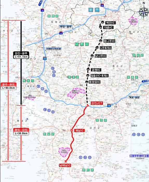 광주~완도간 고속도로 2단계 구간은 강진군 작천면에서 해남군 북평면까지 38.9km 구간으로 국비 1조 5,965억원이 투입된다.