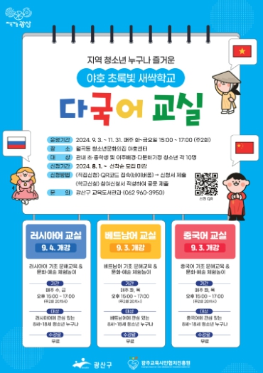 중국어교실과 베트남어 교실은 오는 9월 3일부터 11월 14일까지 진행하며, 러시아어 교실은 9월 4일부터 11월 15일까지다.