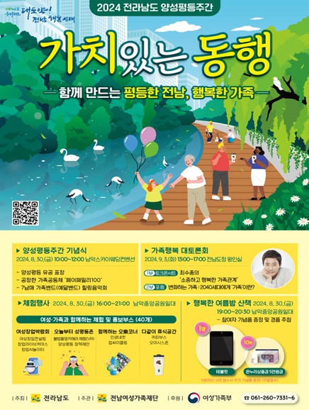 이어 오후 4시 남악중앙공원에서는 가족과 함께 참여하는 다양한 체험·홍보부스가 운영된다. 오후 7시에는 사전 신청한 가족단위나 개인이 참여해 일상 속 성평등 실천을 다짐하는 ‘행복한 여름밤 산책’ 프로그램이 다양한 경품추첨 행사와 함께 진행된다.