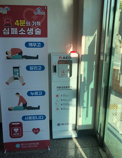 이에 군은 지난해 12월부터 연륙이 안 된 7개 읍면 중 보건·의료시설이 없는 섬마을(금일 용항, 금일 궁항, 보길 보옥, 보길 예작 등)의 마을회관과 경로당 등에 자동 심장 충격기를 설치했다.