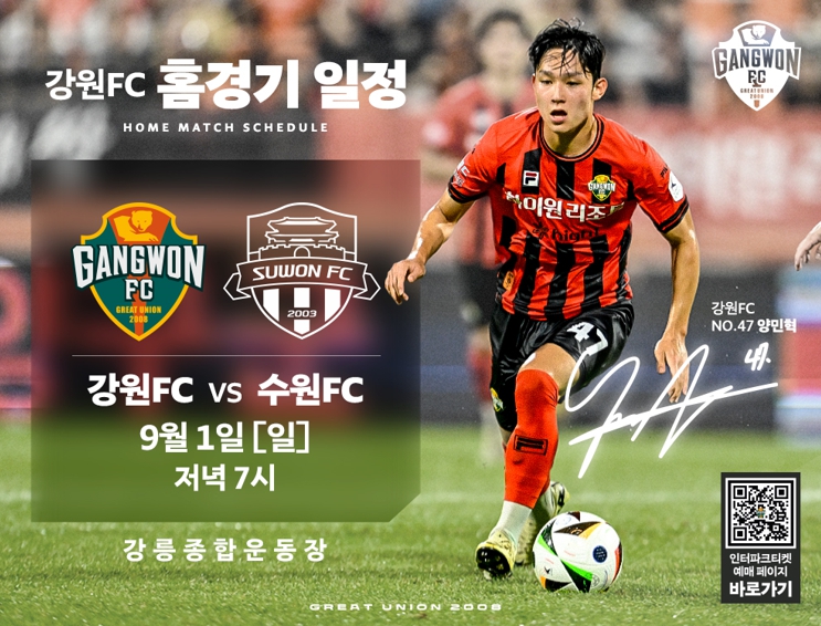 9월 1일 일요일 저녁 7시, ‘2024 하나은행 K리그1, 29라운드’ 강원FC와 수원FC의 경기가 강릉종합운동장에서 펼쳐지는 가운데, 이번 경기는 속초시민과 고성군민을 대상으로 경기관람 티켓을 50% 할인된 가격으로 판매하는 특별한 이벤트를 진행한다.