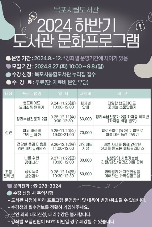 ![]() 목포시립도서관, 2024 하반기 도서관 문화프로그램 수강생 모집 |