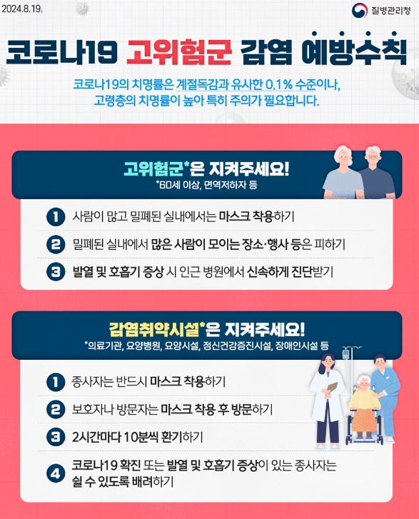 또한 코로나19 고위험군이 많이 이용하는 의료기관과 감염취약시설(요양병원, 요양시설, 정신건강증진시설, 장애인시설 등)에 대해서도 ▲ 종사자, 보호자, 방문자의 마스크 착용 ▲ 2시간마다 10분씩 환기 ▲코로나19 확진 또는 발열 및 호흡기 증상이 있는 종사자의 휴식을 배려해줄 것을 권고했다.