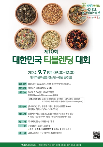 '제10회 대한민국 티 블렌딩 대회’는 보성차를 베이스로 한 블렌딩 차(Tea&Etc /티, 허브, 플레이버)를 만들어 기한(8. 30. 18:00 도착분) 내 출품하면 된다. 금·은·동상 3점에는 농림축산식품부장관, 전라남도지사, 보성군수 훈격의 상이 수여된다.