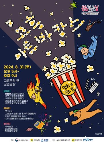 이번 행사는 ▲판타시코의 ‘고흥에서 소통하는 온 가족 영화음악’ ▲보물찾기 ▲LED 반딧불이 만들기 ▲나만의 팝콘 통 만들기 ▲아로마 벌레 기피제 만들기 등 다양한 체험 프로그램이 준비되어 있으며, 오후 7시에는 '아기공룡 둘리: 얼음별 대모험' 영화 상영이 진행된다.