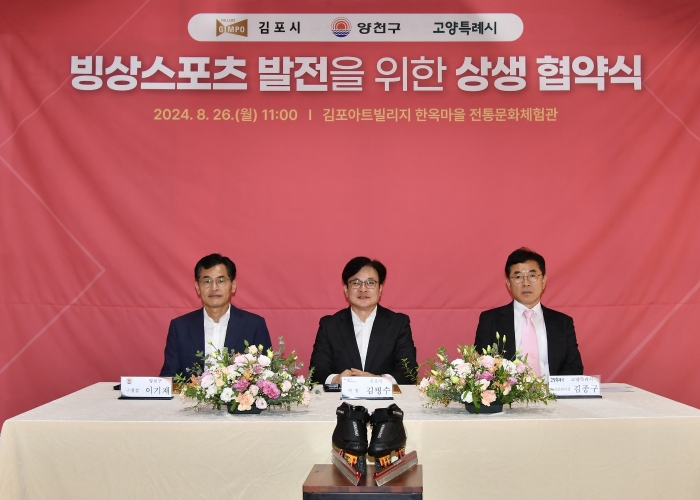 ![]() 김포시(시장 김병수)가 26일 김포아트빌리지에서 서울특별시 양천구(구청장 이기재), 고양특례시(시장 이동환)와 빙상스포츠 발전을 위한 상생 협약을 체결하며, ‘김포국제스케이트장 유치’에 대한 서부권의 결집을 이끌어냈다. |