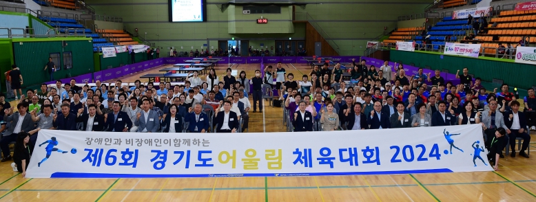![]() 지난 24일 광명시민체육관에서 개최된 '제6회 경기도어울림체육대회 2024 개막식'에서 참가자들이 기념사진을 촬영하고 있다. |