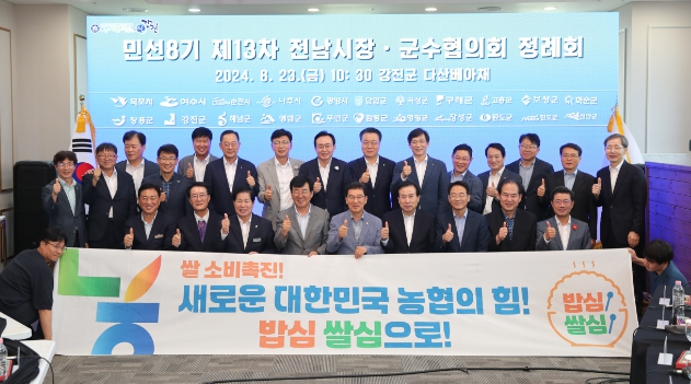 ![]() ‘민선8기 제13차 전남시장군수협의회 정례회’가 참가자들이 우리쌀 소비를 촉진을 권장하기 위해 홍보 현수막과 함께 우리쌀이 최고라는 의미로 엄지손가락을 들어보이고 있다. |