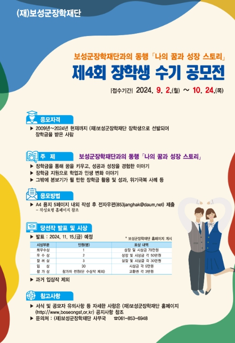 ![]() 보성군장학재단 ‘제4회 장학생 수기 공모전’ 개최_ (재)보성군장학재단 제4회 장학생 수기 공모전 포스터 |