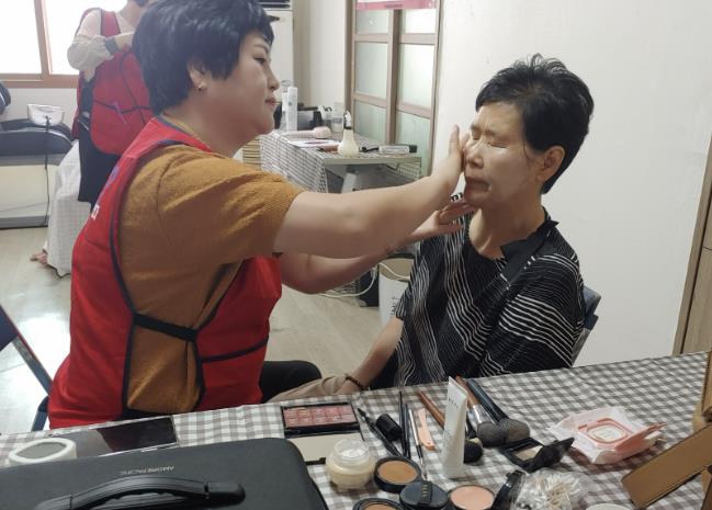 이어 마을회관 안으로 들어가자, ‘우리마을에 영암봉사단이 떴다’란 문구가 써진 붉은 조끼를 입은 봉사단원들이 천 어르신을 맞았다. 이들은 삐죽했던 머리카락을 잘라주고, 메이크업으로 얼굴에 꽃단장도 해줬다. 옆에서 커트와 메이크업을 기다리던 다른 마을 어르신들은 “오메, 저 아짐 겁나 이뻐졌어야”라며 부러움 반 기대 반의 마음을 쏟아냈다.