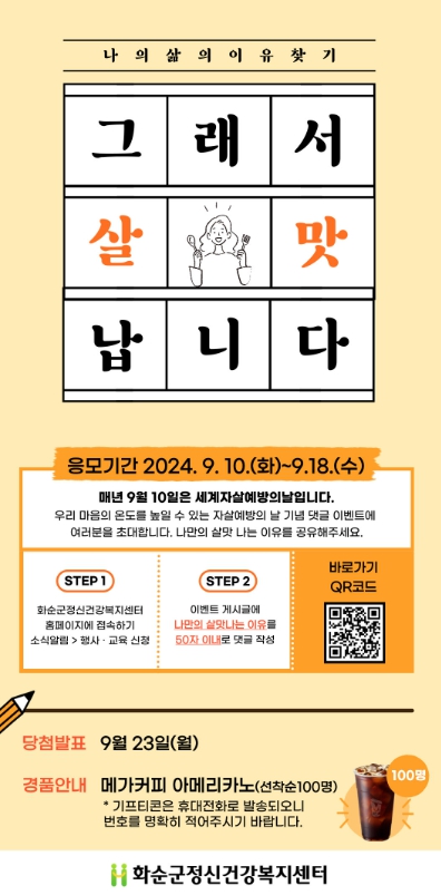 또한, 자살예방의 날인 9월 10일(화)부터 추석 연휴인 18일 수요일 까지는 화순군정신건강복지센터 홈페이지에서 나의 삶의 이유 찾기로 “그래서 살맛 납니다” 댓글 이벤트가 이어진다.