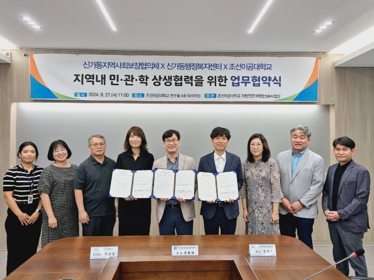 신가동은 27일 조선이공대학교에서 협약식을 갖고 조선이공대학교(총장 조순계), 신가동 지역사회보장협의체(위원장 조무영, 이하 지사협)와 주민 복지증진을 위한 상호협력을 다짐하는 업무협약을 체결했다.
