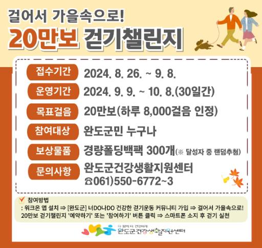참여 방법은 ▶워크온 앱 설치 ▶완도군 커뮤니티 ‘너DO 나DO 건강한 걷기 운동’ 가입 ▶걸어서 가을 속으로! 20만 보 걷기 챌린지 '예약하기' 또는 '참여하기' 선택 후 스마트폰을 소지하고 걷기를 실천하면 된다.