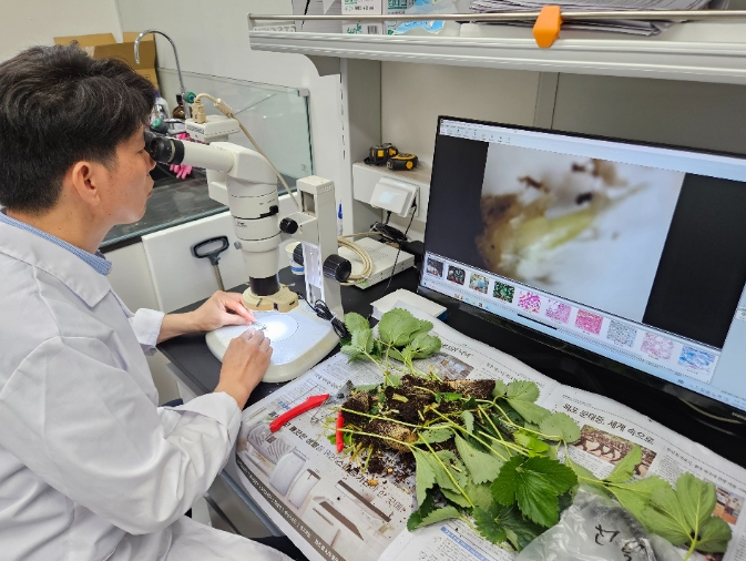 ![]() 농업기술센터에서 실체현미경을 이용해 딸기 꽃눈분화 검경 장면 |