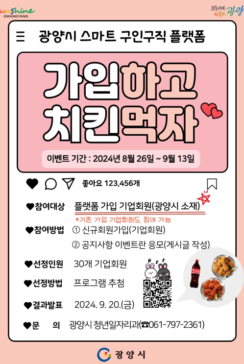 ![]() 광양시, 스마트 구인구직 플랫폼 기업회원 대상 가입하고 치킨먹자!」 |