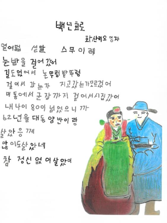 군에 따르면 최근 국가평생교육진흥원이 주최한 전국 성인문해교육 시화전에서 오영자(삼계, 81세) 어르신의 ‘백년회로(해로)’가 전라남도교육감상을 수상했다.