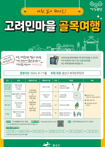 ‘고려인마을 골목여행’은 광산구가 지난해부터 추진 중인 ‘고려인 역사마을 1번지 관광 활성화 사업’의 하나로, 고려인 강제이주 역사와 항일‧문화운동 등 고려인 역사‧문화를 소재로 기획한 고려인마을 탐방프로그램이다.