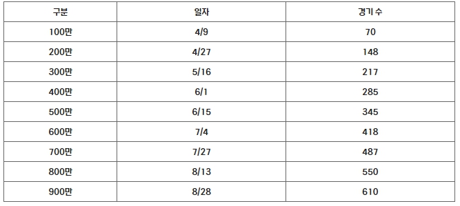 ![]() 2024 시즌 100만 단위 달성 일자 및 경기 수 |